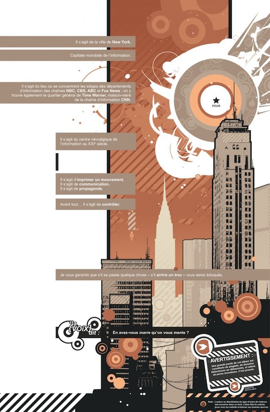 « Il s'agit de la ville de New York. Capitale mondiale de l'information. Il s'agit du lieu où se concentrent les sièges des départements d'information des chaînes NBC, CBS, ABC et Fox News ; on y trouve également le quartier général de Time Warner, maison-mère de la chaîne d'information CNN. Il s'agit du centre névralgique de l'information au XXIè siècle. Il s'agit d'imprimer un mouvement. Il s'agit de communication. Il s'agit de propagande. Avant tout...il s'agit de contrôler. »