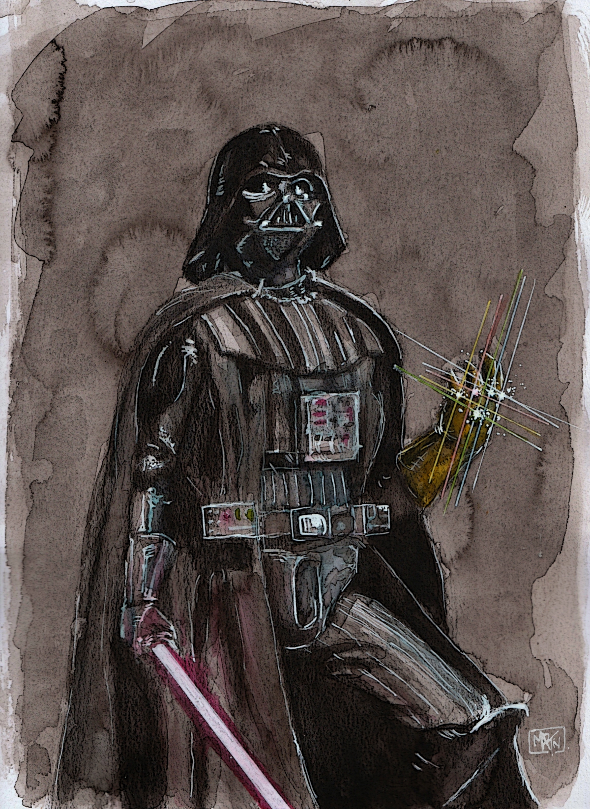 Et en dernier, on retrouve mon sith préféré (non ce n'est pas dark "molle"... l'animé en a fait une espèce de sauterelle sous acide...). Il s'agit donc bien de ce cher Lord Vader. Suite à secret War de Marvel je me suis amusé à imaginer une version ultime de cette guerre du multivers où Dark Vador serait le détenteur du gant de l'infini (car contrairement à Thanos il ne s'est jamais fait battre par squirrel girl...).