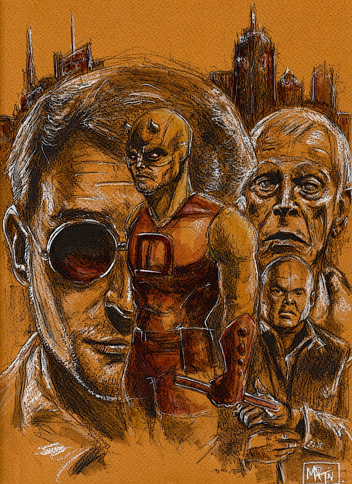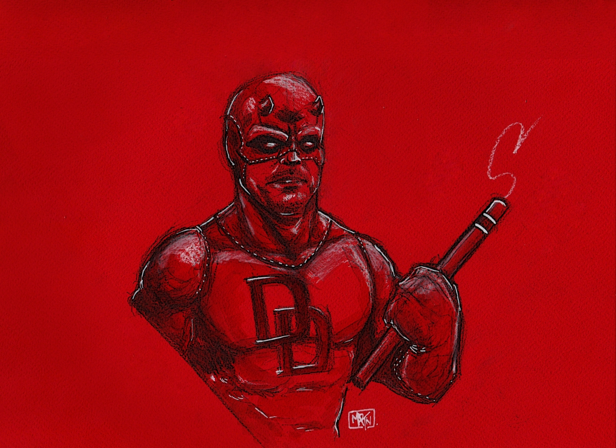 Pour finir j'ai réalisé une petite illustration (ben oui je suis avant tout ici pour nourrir mon égo-trip! ) sur la série de Netflix avec un petit fantasme avec la présence du costume jaune de Daredevil, avec en bonus un petit sketch de la version rouge du diable de Hell’s Kitchen.