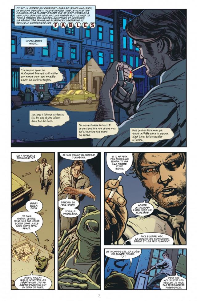 Visuellement, que vous soyez lecteur de Fables ou que vous ayez joué à The Wolf Among Us, vous serez en terrain connu. Le dessin, soigné, est dans les standards de ceux proposés par Fables et on retrouve d’ailleurs certains artistes ayant déjà officié sur la série mère ou ses spin-off. Cependant, le style graphique évolue parfois du tout au tout lorsque le récit revient sur l’histoire, plus ou moins revisitée, de certains personnages. Ces parenthèses inédites sont assez sympathiques et apportent une réelle fraîcheur, contrairement aux scènes d’actions directement reprises du jeu. Ainsi, les backgrounds de certains personnages sont les seuls éléments à vraiment bénéficier d’un enrichissement.