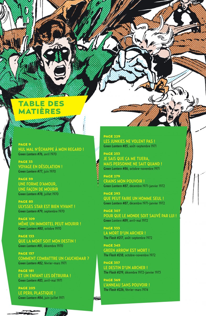 Ce gros pavé (368 pages) scénarisé par Denis O'Neil et dessiné en grande partie par Neal Adams contiendra les numéros #76-87, 89 ainsi que les numéros Flash #217-219 et 226. Ces numéros du début des années 70 marquent une époque de renouveau dans l'écriture des comics puisque ceux-ci ont commencé à aborder des thèmes plus proches du quotidien comme l'écologie, la crise économique ou encore la drogue. Les parfaits exemples de ce passage à l'Âge de Bronze restent d'ailleurs les numéros 85 et 86 de la série Green Lantern/Green Arrow dans lesquels les deux héros verts découvrent que Roy Harper, surnommé Speedy, est un "junkie".