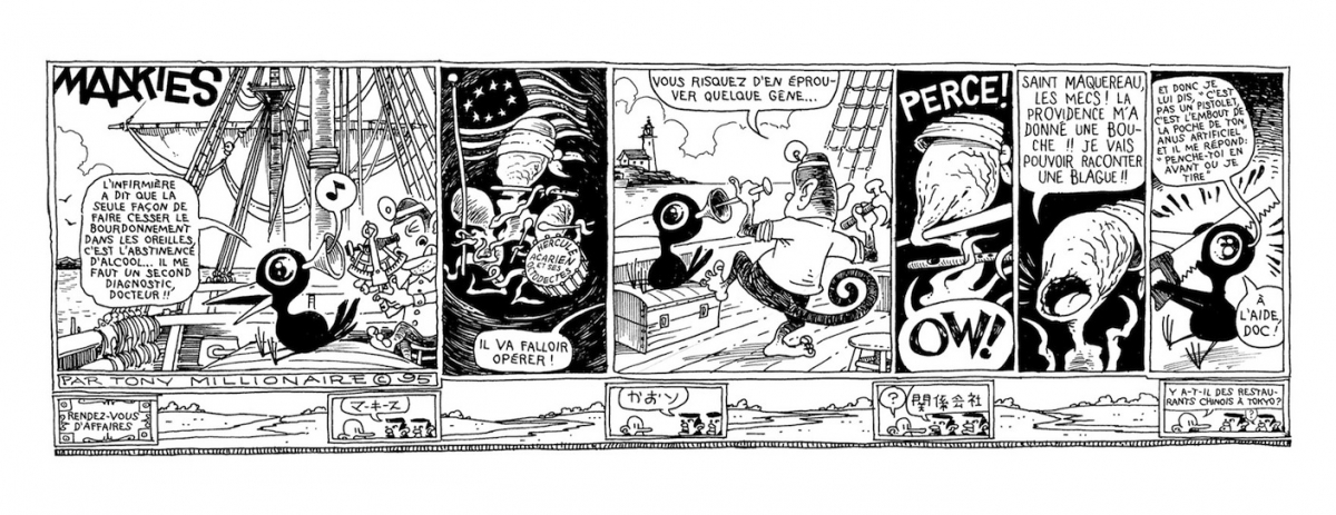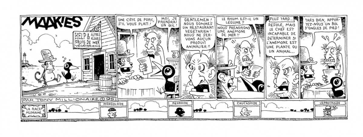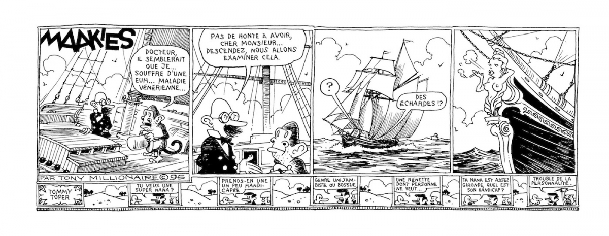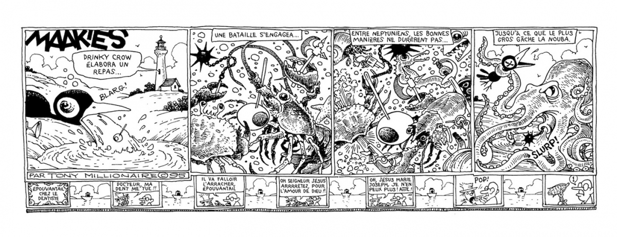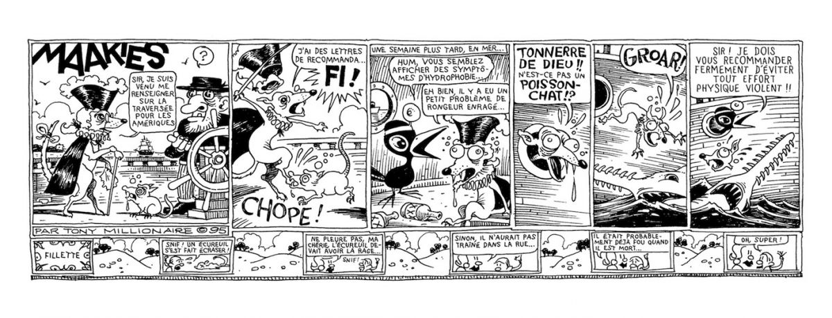 Dans un mois jour pour jour, Rackham publie un des immanquables du strips américain : Protomaakies de Tony Millionnaire. L'ouvrage recueille les planches réalisés par l'auteur entre 1994 et 1999. À noter que l'éditeur français publiera l'intégralité des Maakies au rythme d'un volume tous les 6 mois, en respectant la pagination et le format italien des éditions américains originales ! En attendant, je vous laisse admirer les premières planches.