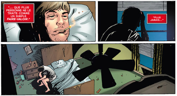 Ce premier tome est sous-titré Descente aux Enfers, et c'est exactement cela que va nous proposer Straczynski. Une lente chute de celui qui était dans la lumière des super-héros révérés par tous à une loque humaine, obsédé par la mort de Red Cowl qu'il n'a su venger. Connaissant bien la destruction que peut s'infliger un homme qui a perdu tout espoir, JMS nous dépeint un personnage littéralement dévasté, alcoolique, sensible à l'extrême aux critiques à son encontre. Tous le rejettent et lui passe son temps à prendre de mauvaises décisions. Ce qu'il ne sait pas encore, c'est qu'il est le dindon de la farce : son mentor n'est pas mort, et profite allégrement de jours plus tranquilles sur une île paradisiaque.