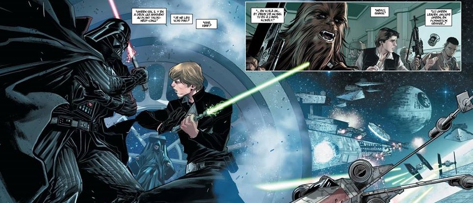 En revanche, tous les lecteurs risquent d'être impressionnés par les planches de Marco Checchetto. S'il est plus à l'aise avec le technique - vaisseaux et pistolasers en tête - qu'avec l'organique - certains visages laissent à désirer - on sent que le dessinateur à envie de s'éclater, et il mettra toute sa passion au service de cette brève série. Notamment dans des doubles pages souvent très fouillées : si vous avez envie de voir des A-Wing en pagaille en train de survoler des TB-TT vengeurs, la série vous offrira quelques moments de bravoure assez appréciables à l'œil, mais on en aurait profité bien plus si la colorisation d'Andress Mossa, dans des tons très industriels, n'avait pas été si froide.