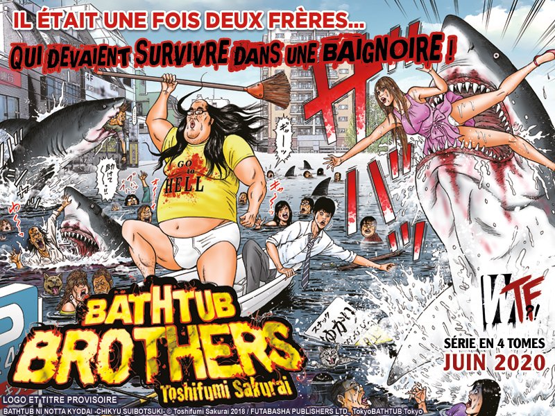 Autour d'elles et une série de shôjo adulte par Shino Torino, en deux tomes. On y suit l'histoire de deux jeunes femmes qui se retrouvent quelques années après être sorties ensemble. L'une a un enfant, et tous les trois ils vont former un foyer atypique, puisque les deux femmes ont malgré tout décidé de ne pas se remettre ensemble. Le premier tome est prévu pour le mois d'avril. Bathub Brothers est une série What the fuck par Toshifumi Sakurai l'auteur de Ladyboys vs. Yakuzas et La virginité passé 30 ans. Deux frères se retrouvent coincés dans une baignoire alors que la terre fait face à une spectaculaire montée des eaux. Et oui, il y aura des requins ! La série et terminée en quatre tomes et le premier arrive en juin.
