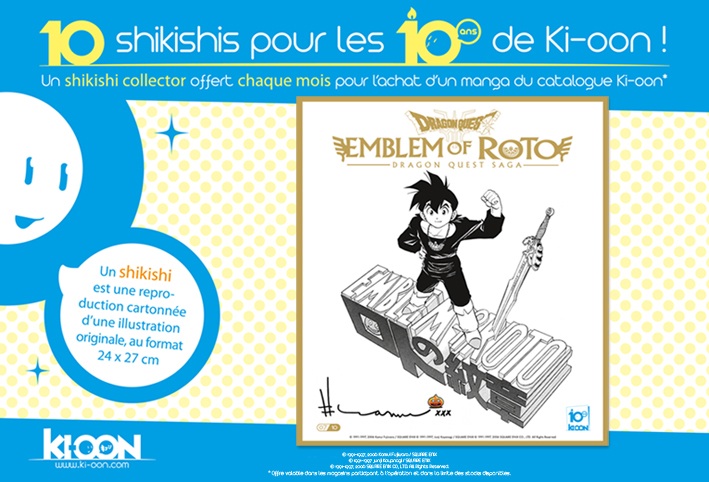 En effet, à l'occasion de la Japan Expo et de la venue de Kamui Fujiwara sur le festival, Ki-Oon offre ce mois-ci un shikishi Dragon Quest : Emblem of Roto pour l'achat d'un manga du catalogue de l'éditeur.
