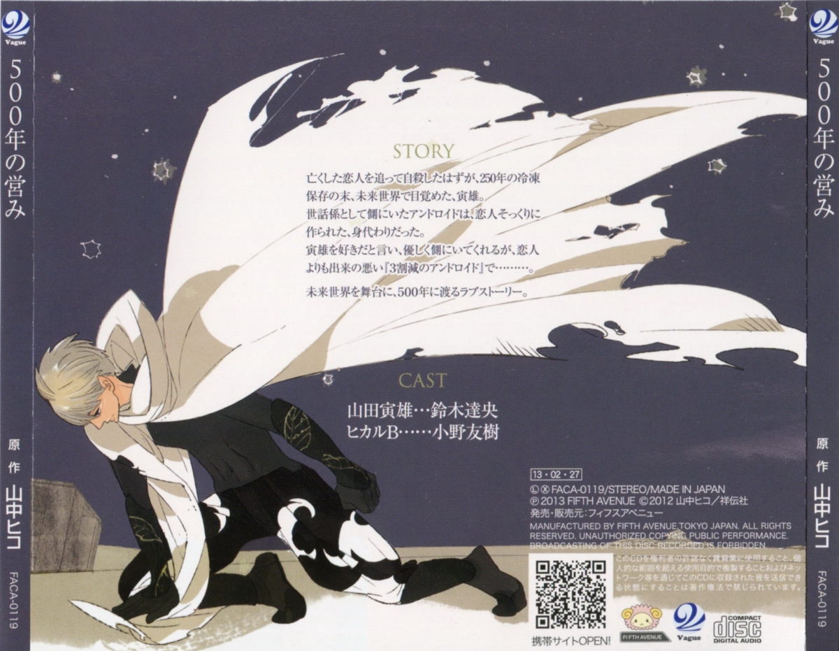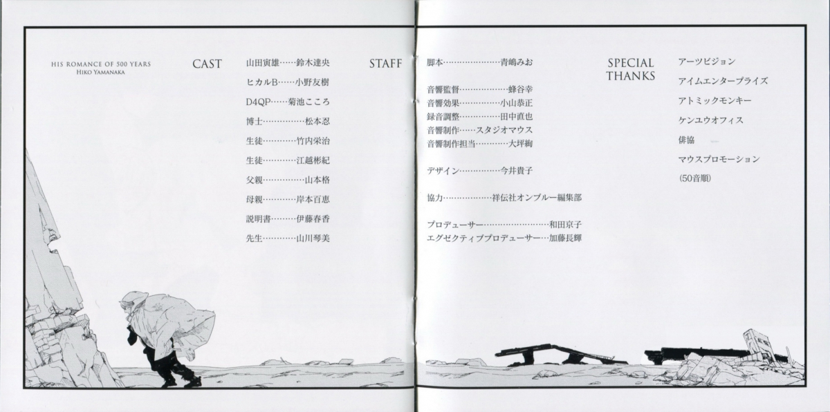 | Drama traductions: | 1. 250年後 - 250 ans plus tard 2. 3割減のアンドロイド - Un androïde imparfait 3. 変わりない1日 - Un jour comme les autres 4. 本来の代用品 - Produit de substitution 5. 約束の場所 - L'endroit où l'on s'était donné rendez-vous 6. ボーナストラック·500年後 - 500 ans plus tard |