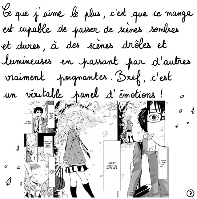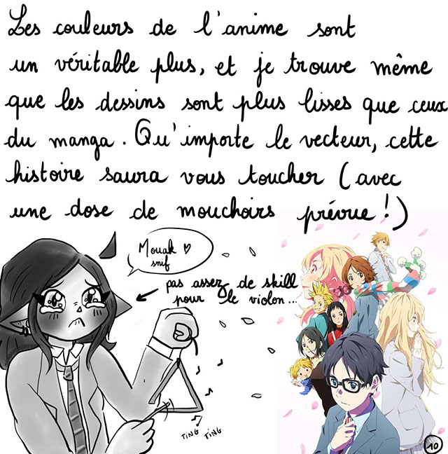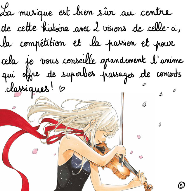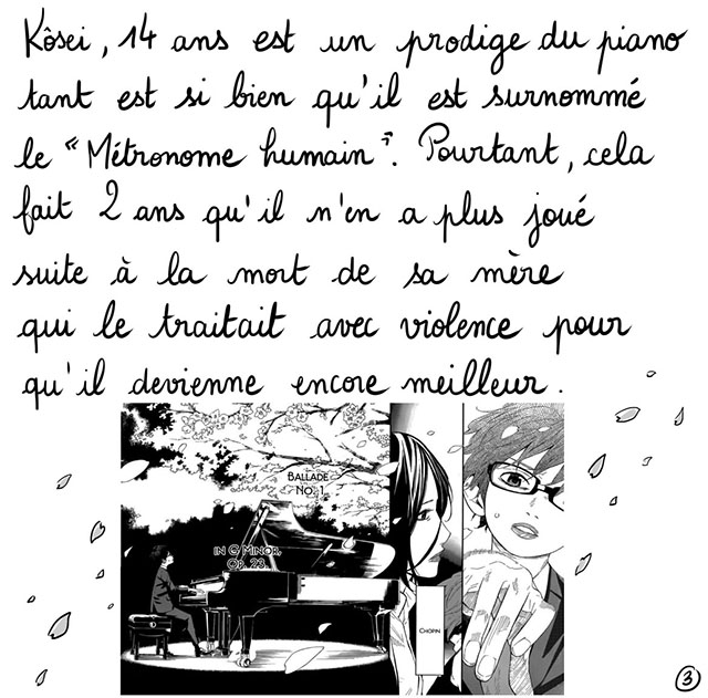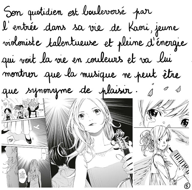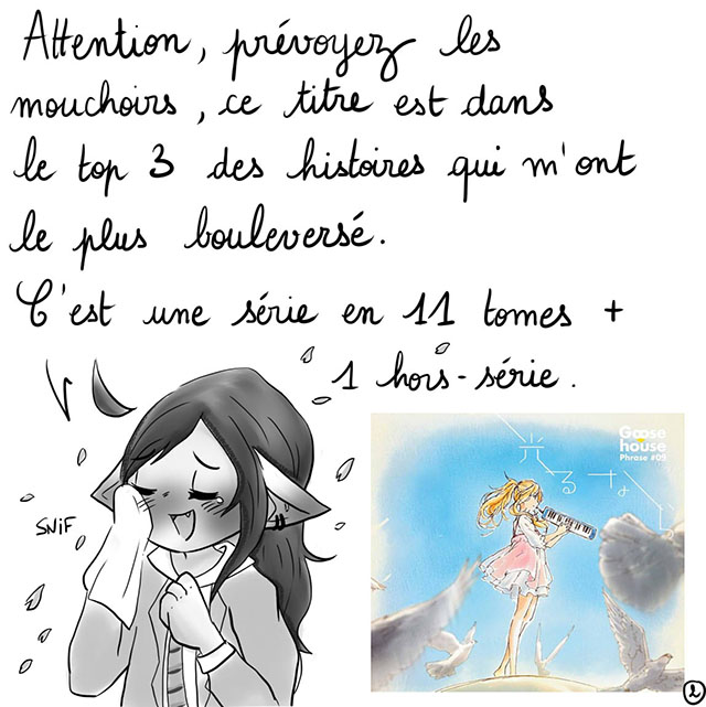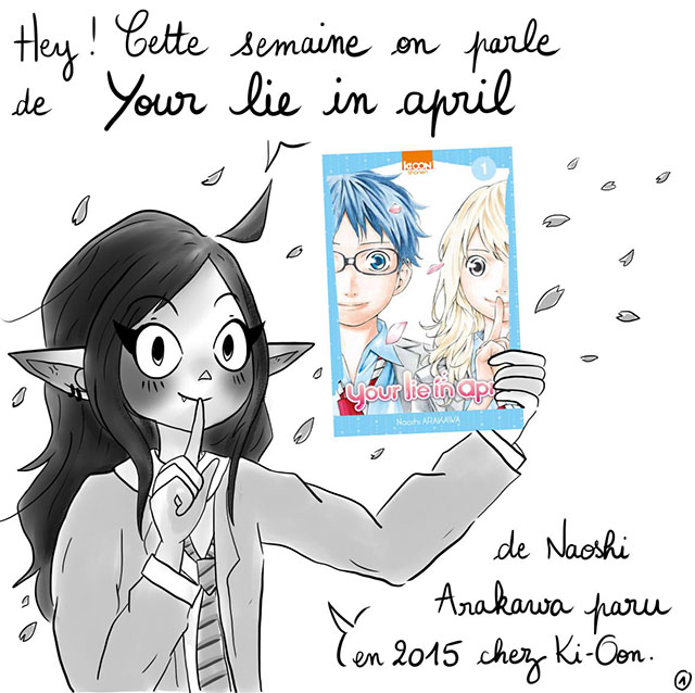 C'est parti pour une nouvelle critique de Tsu Goupil ! Cette semaine notre chroniqueuse-dessinatrice continue à explorer les classiques avec Your lie in april, démarré en 2015 chez Ki-oon. L'histoire de deux musiciens, une passionnée et un traumatisé... Pour en savoir plus sur ce manga vous pouvez lire la critique des deux premiers tomes par Elsa. Et pour découvrir la série animée, rendez-vous sur Netflix ! Enfin, pour suivre Tsu Goupil au quotidien, rendez-vous sur son compte instagram (qui vient de passer les 1000 abonnés !).