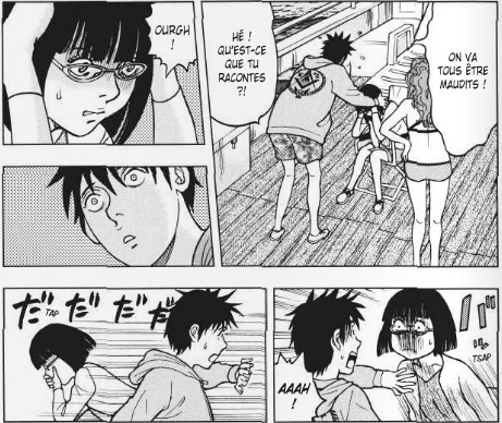 Comme dans tout bon slasher, les jeunes japonais vont se retrouver piégés suite à un évènement marquant, perdant au passage tout moyen de transport et de communication. Rapidement, des tensions vont apparaître entre eux, et c'est là que l'auteur se démarque de ce qui se fait dans cette grande tendance actuelle.