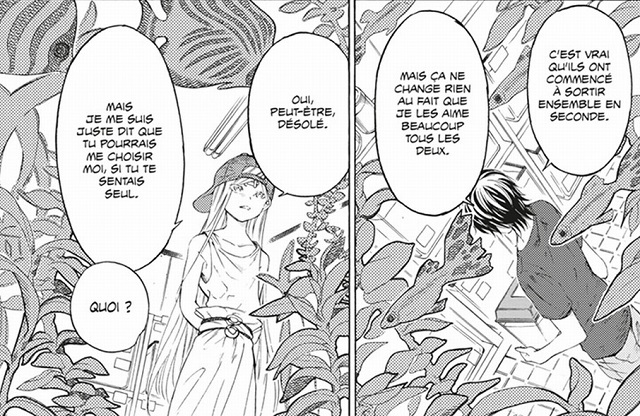 En découvrant le pitch du manga, j'ai tout de suite cru que l'album parlerait de définition des genres, du fait d'être une fille ou un garçon et de ce que ça implique. Pourtant, alors que l'histoire de Toki est particulièrement surprenante, il (je vais le genrer au masculin, comme dans le manga) fait plutôt office dans ce premier tome de prétexte pour inciter les autres personnages de l'histoire à s'interroger sur leur propre condition. Mitsuharu par exemple, ne parvient pas à trouver sa place dans son trio d'amis. Doit-il s'en faire de nouveaux, ou bien leur dire clairement ce qu'il ressent ? De manière indirecte, la venue de Toki va lui permettre de faire la lumière sur tout ça. Et puis il y a ce prof bizarre, qui porte constamment un masque parce qu'il a peur du regard des autres. En rencontrant Toki et Mitsuharu, lui aussi va tenter de comprendre d'où vient son propre mal-être.