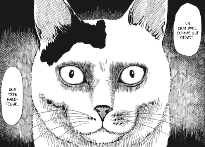 Ce pourrait être un manga sur les chatsqui ressemble à tous les autres, mais avec Junji Itô le récit prend une tournure imprévue. Réutilisant les codes du manga horrifique qu'il maitrise évidemment à merveille, il réussit à rendre hilarantes des scènes anodines. La conversation la plus banale prend une tournure angoissante quand elle met des personnages sans yeux ou au visage affreusement déformé. Les chats se transforment en horribles créatures d'une case à l'autre, et à dire vrai tout le monde, chats compris, a l'air possédé dans ce manga.