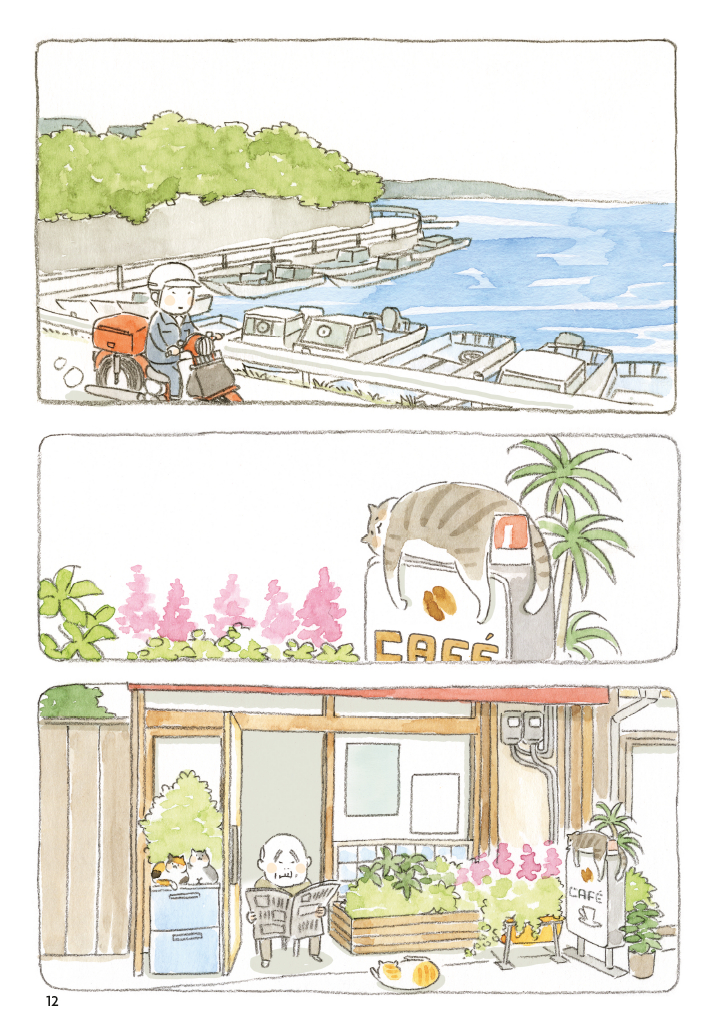 Le Vieil Homme et son Chat, c’est le genre de livre qui vous ferait sentir les odeurs du port lorsque Daikichi et Iwao pêchent, celles des feuilles, fleurs et pollen à l’été et au printemps, des châtaignes que ramasse Yoshié (aussi appelée Mémé), épouse décédée de Daikichi lors de l’épisode flash-back qui nous apprend comment Tama entra dans la vie du couple pour la première fois (et comment Yoshié fit la requête à Tama de toujours veiller sur “Pépé” (Daikichi) juste avant de partir ; prudence, globes oculaires à potentiel humides !) etc…