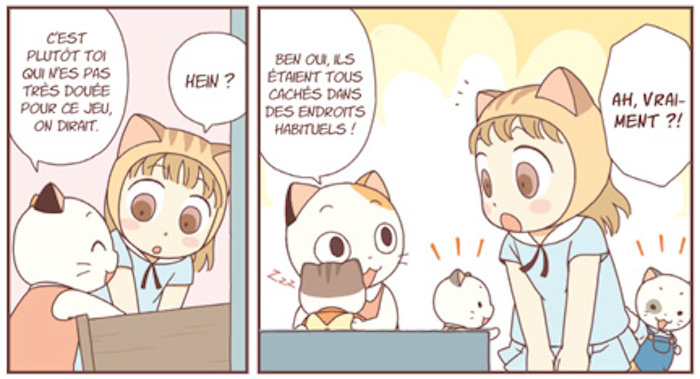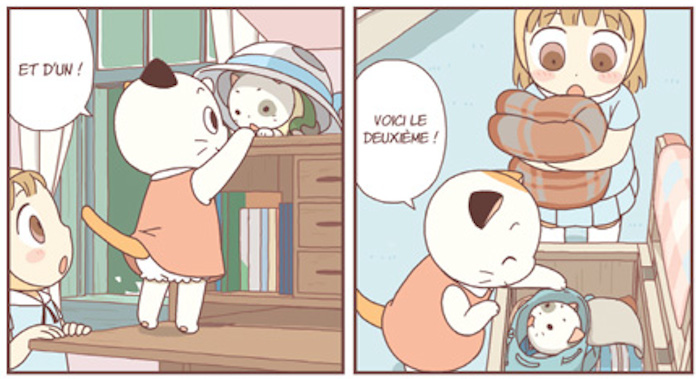Un lecteur adulte trouvera peut-être que ce petit recueil d'histoires courtes manque un peu d'enjeux. Ce sont vraiment des petits instantanés de vie légers, où la petite fille s'adapte à sa nouvelle vie en essayant de ne pas dévoiler sa vraie nature. On ne s'attache pas autant qu'on le voudrait aux personnages, mais nul doute que les plus petits apprécieront cette petite bande de chatons débordant de joie de vivre. Nekojima est plein d'ondes positives, avec de jolies valeurs comme l'importance de l'amitié, et un regard bienveillant sur la nature.
