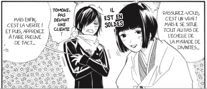 On pourra peut-être regretter ce basculement, tant le début de Noragami est drôle, farfelu et ultra rythmé. Pourtant, il faut avouer que ce récit qui gagne en intensité et en sérieux est aussi intéressant, et éveille la curiosité. De divinité ratée, on entrevoit en Yato un potentiel pour évoluer, Hiyori s'adapte à sa nouvelle vie, pendant qu'un nouveau shinki (l'esprit au service du dieu) entre en scène et bouscule ce début de routine qui se mettait en place. Reste donc à voir comment l'auteure va continuer de construire son récit dans l'univers qu'elle a mis en place.