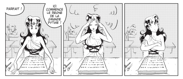 Notre héroïne, Pythie, est une prêtresse au temple d'Apollon. Et un jour, elle reçoit un visiteur au temple qui se montre un peu trop entreprenant. Mais elle n'est pas là pour ça, elle n'est pas au temple d'Aphrodite. Donc elle le repousse d'abord gentiment, et comme il ne comprend pas, plutôt violemment, en n'hésitant pas à utiliser ses poings. Elle va jusqu'à le défigurer.