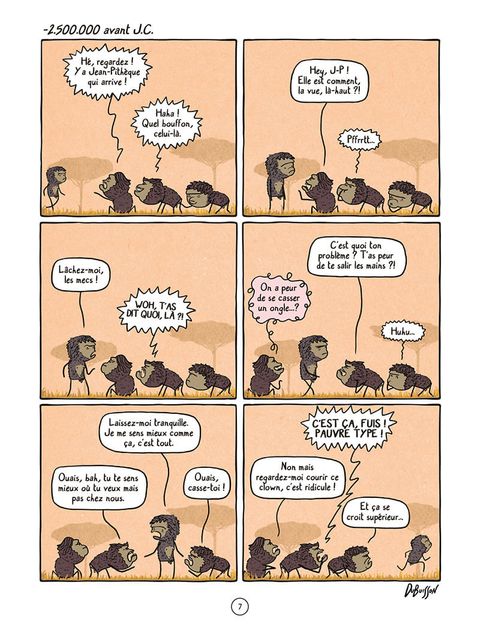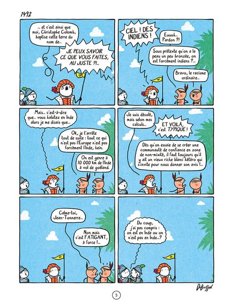 Les questions relatives au sexisme, au racisme, à l'écologie, etc. , s'invitent dans des moments historiques où elles auraient pu émerger, créant un décalage incongru mais bien pertinent. On y croise Christophe Colomb, des Vikings, des Egyptiens, des chevaliers... et des thèmes tels que le street art des cavernes ou le quotidien d'une influenceuse mode à la cour de Versailles... Bref, un livre universel.