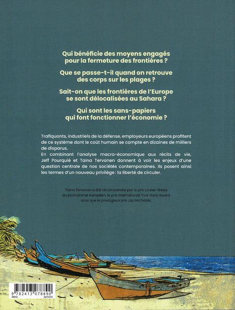 Qui profite des moyens engagés en faveur de la fermeture des frontières ? Que se passe-t'il quand on retrouve des corps sur les plages ? Sait-on que les frontières de l'Europe se sont délocalisées au Sahara ? Qui sont les sans-papiers qui font fonctionner l'économie ? Trafiquants, industriels de la défense, employeurs européens profitent de ce système sans se préoccuper des 40 000 morts et disparus.