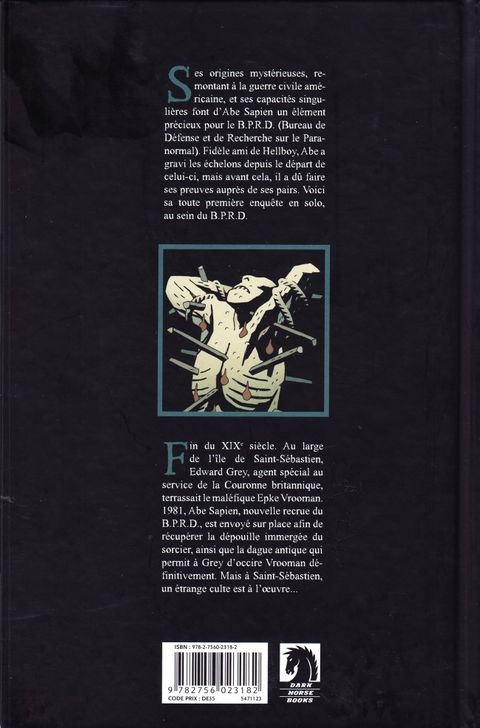 Ses origines mystérieuses, remontant à la guerre civile américaine, et ses capacités singulières font d'Abe Sapien un élément précieux pour le B.P.R.D. (Bureau de Défense et de Recherche sur le Paranormal). Fidèle ami de Hellboy, Abe a gravi les échelons depuis le départ de celui-ci, mais avant cela, il a dû faire ses preuves auprès de ses pairs. Voici sa toute première enquête en solo, au sein du B.P.R.D. Fin du XIXe siècle. Au large de l'île de Saint-Sébastien, Edward Grey, agent spécial au service de la Couronne britannique, terrassait le maléfique Epke Vrooman. 1981, Abe Sapien, nouvelle recrue du B.P.R.D., est envoyé sur place afin de récupérer la dépouille immergée du sorcier, ainsi que la dague antique qui permit à Grey d'occire Vrooman définitivement. Mais à Saint-Sébastien, un étrange culte est à l'oeuvre...