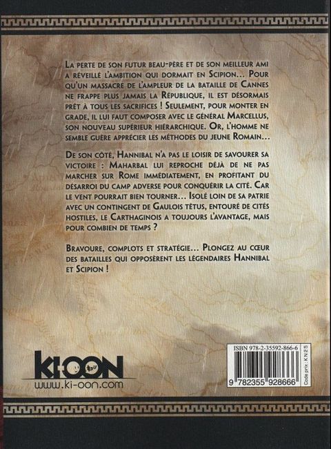 La perte de son futur beau-père et de son meilleur ami a réveillé l'ambition qui dormait en Scipion. Pour qu'un massacre de l'ampleur de la bataille de Cannes ne frappe plus jamais la République, il est désormais prêt à tous les sacrifices ! Seulement, pour monter en grade, il lui faut composer avec le général Marcellus, son nouveau supérieur hiérarchique. Or, l'homme ne semble guère apprécier les méthodes du jeune Romain. De son côté, Hannibal n'a pas le loisir de savourer sa victoire : Maharbal lui reproche déjà de ne pas marcher sur Rome immédiatement, en profitant du désarroi du camp adverse pour conquérir la cité. Car le vent pourrait bien tourner. Isolé loin de sa patrie avec un contingent de Gaulois têtus, entouré de cités hostiles, le Carthaginois a toujours l'avantage, mais pour combien de temps ? Bravoure, complots et stratégie. Plongez au coeur des batailles qui opposèrent les légendaires Hannibal et Scipion !