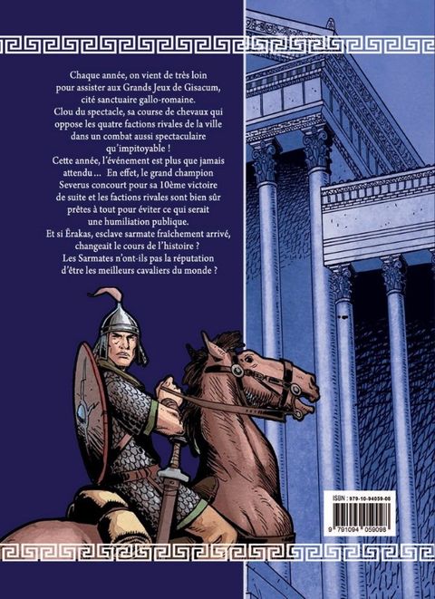 Chaque année, on vient de très loin pour assister aux Grands Jeux de Gisacum, cité sanctuaire gallo-romaine. Clou du spectacle, sa course de chevaux qui oppose les quatre factions rivales de la ville dans un combat aus-si spectaculaire qu'impitoyable ! cette année, l'événement est plus que jamais attendu... en effet, le grand champion severus concourt pour sa 10ème victoire de suite et les factions rivales sont bien sûr prêtes à tout pour éviter ce qui serait une humiliation pu-blique. Et si Erakas, esclave sarmate fraIchement arrivé, changeait le cours de l'histoire ? les sarmates n'ont-ils pas la réputation d'être les meilleurs cavaliers du monde ?