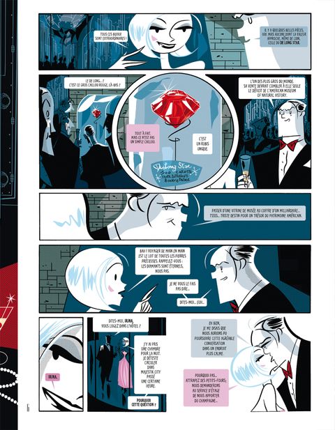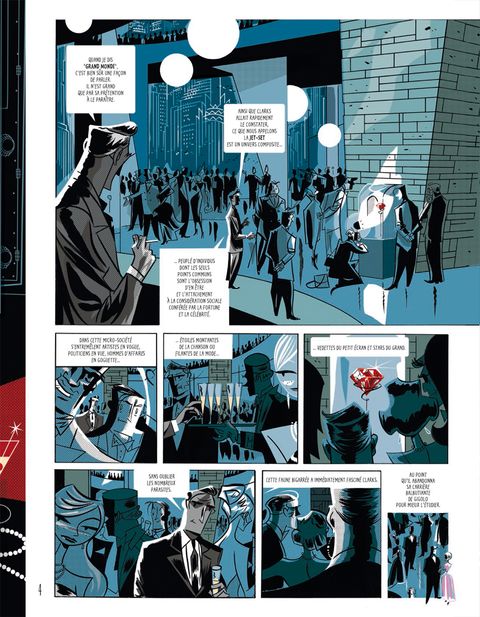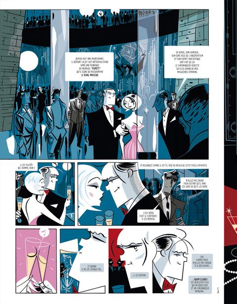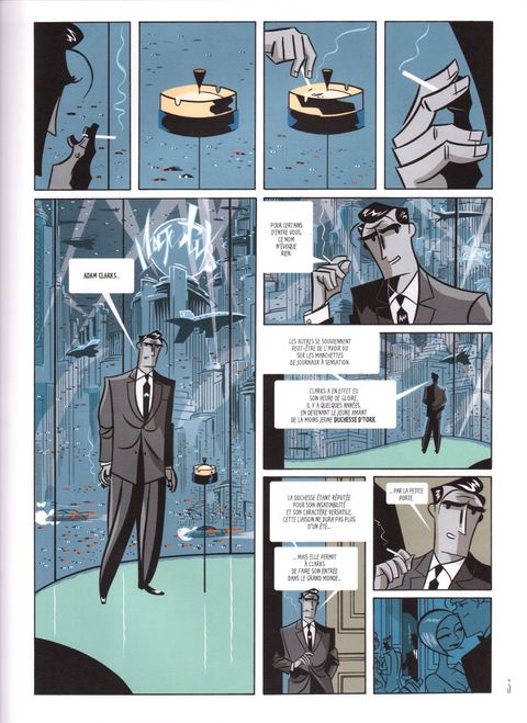 Dans un XXIe siècle fantasmé où la guerre froide sévit toujours et où la conquête de Mars est en marche, c’est lors d'une soirée mondaine où les « grands » de ce monde ont l’habitude de se retrouver que l’énigmatique Adam Clarks montre son vrai visage. On pourrait le croire trop occupé à faire des courbettes aux puissants et à séduire des beautés fatales. Mais il ne perd pas de vue son véritable objectif : un rubis de 100 carats d’une valeur inestimable, exposé à la vue de tous : le Long Star. La nuit, Adam fait montre de ses talents de monte-en-l’air pour subtiliser le bijou. Personne n’a rien vu, rien entendu. Personne ? Pas si sûr... Devenu à la fois la cible du KGB et de la CIA, Adam va devoir jouer sur les deux tableaux s’il veut s’en sortir. Avec Adam Clarks, Régis Hautière nous fait découvrir un héros classe et charismatique, entre Arsène Lupin et Mad Men, évoluant dans un univers proche des films d’espionnage d’antan. En digne représentant de l’école « atome », le trait stylisé et élégant d’Antonio Lapone restitue à merveille cette savoureuse ambiance uchronique, mêlant le futurisme à l’esthétisme des années 1960.