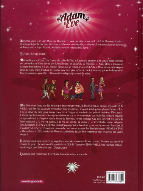 Avec Agathe, sa chienne. Il prononce alors un discours , de bienvenue : "Soyez féconds, multipliez-vous et remplissez la Terre !" Le 7e jour, il prend ses RTT. Mais voilà que le 8e jour, Eve frappe à la porte de Dieu et lui pose la question à ne jamais poser (question qui deviendra au fil des siècles une habitude que l'on qualifiera de féminine) : "Mais alors, si les enfants naissent d'un homme et d'une femme, moi je suis un enfant, je suis né d'Adam. Donc Adam est mon père et toi, tu es ma mère. Je refuse de coucher avec mon père même si c'est toi, maman, qui me le demande !" Enorme problème pour Dieu l'humanité va disparaître avant de naître. Mais Dieu ne se laisse pas déstabiliser par les premiers venus. Il décide de lancer aussitôt le projet Eden Ville : une sorte de vivarium pré-humain pour sélectionner le couple idéal qui remplacera Adam et Eve. Il va se servir du futur pour mieux retourner à l'origine et construire un présent topissime. Dieu, quoi ! Il sélectionne trois couples. Ceux qui ne résisteront pas ou ne montreront pas toutes les aptitudes requises, ou qui céderont il n'importe quelle forme de faiblesse, seront éliminés. Ces êtres devront être parfaits, hyper-résistants à la vie en couple, à la vie en société, du climat et il d'éventuelles autres religions. Tous habiteront Eden Ville ! De multiples épreuves et tests en tout genre, voués à évaluer leur Capacité à s'adapter et préserver l'harmonie universelle, leur seront soumis. Les finalistes seront ADAM et EVE, "The real one" ! Et la mission de Dieu sera accomplie devant les Hommes et pour les siècles des siècles. Amen ! Il fabrique ainsi trois "experts en expertise" avec des morceaux de son cerveau, ils seront garants de la réussite du projet. Ils sont aussitôt transférés du QC de l'opération Eden Ville, une structure spécialement conçue pour l'observation : I'Observatoire. L'aventure peut commencer. L'éventuelle humanité retient son souffle.