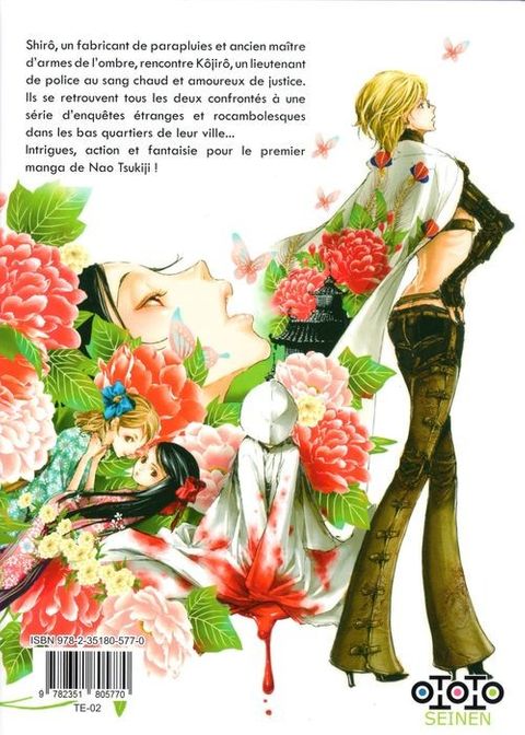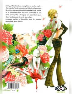 Shirô, un fabricant de parapluies lascif et sensuel, ancien maître d'arme de l'ombre, détestant par-dessus tout porter des sous-vêtements, rencontre Kôjirô, un lieutenant de police au sang chaud et amoureux de justice, dans un univers fantastique où l'extraordinaire surpasse bien souvent la raison. Ils se retrouvent tous les deux confrontés à une série d'incidents rocambolesques et paranormaux dans les bas-quartiers de leur ville... Tsukiji Nao nous gratifie d'une histoire palpitante souligné par un graphisme de toute beauté empli de finesse et de séduction. A dévorer sans modération !