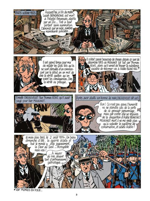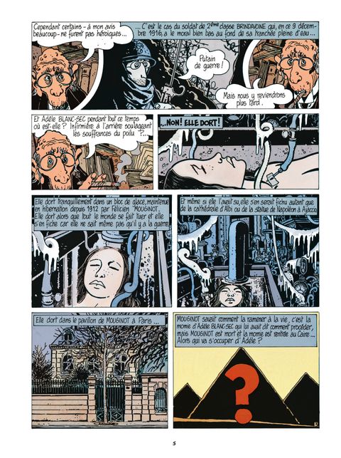 Adèle Blanc-Sec est maintenue en hibernation dans un bloc de glace depuis 1912. La Première Guerre mondiale a maintenant éclaté et, sur le front, les combats font rage. C'est là que le soldat de 2e classe Brindavoine fait une étrange rencontre : une statue qui parle lui confie la mission de l'aider à ramener Adèle à la vie...