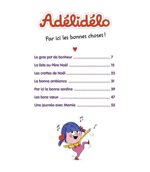 Adélidélo nous invite à faire une provision de bonnes choses pour l'année à venir : bisous, gourmandises, petits cadeaux, grands rêves et parties de rigolade : 7 histoires anti-morosité, pour commencer l'année avec le sourire !Dans ce tome 9 :Le gros pot de bonheurLes truffesLa liste au Père NoëlLa bonne ambiancePar ici la bonne sardineLes bons voeuxUne journée avec Mamie