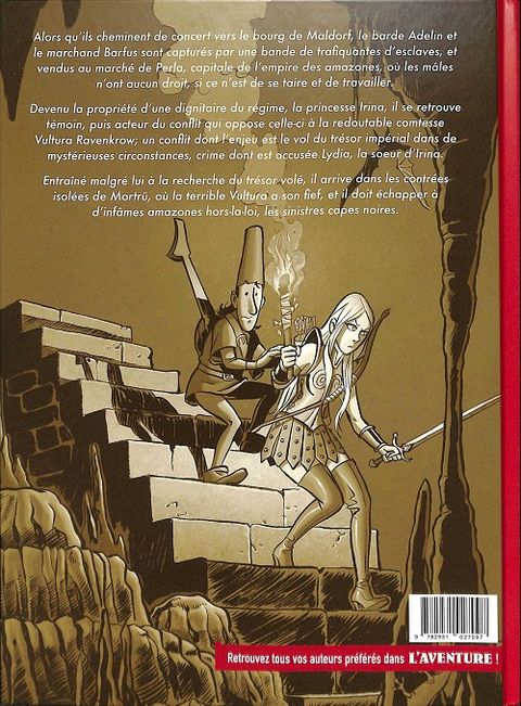 Alors qu'ils cheminent de concert vers le bourg de Maldorf, le barde Adelin est capturé par une bande de trafiquantes d'esclaves, et est vendu au marché de Perla, capitale de l'empire des Amazones, où les mâles n'ont aucun droit, si ce n'est de se taire et travailler. Devenu la propriété d'une dignitaire du régime, la princesse Irina, il se retrouve témoin, puis acteur du conflit qui oppose celle-ci à la redoutable comtesse Vultura Ravenkrow ; un conflit dont l'enjeu est le vol du trésor impériale dans de mystérieuses circonstances, crime dont est accusée Lydia, la soeur d'Irina. Entrainé malgré lui à la recherche du trésor volé, Adelin arrive dans les contrées de Mortrü, où la terrible Vultura a son fief, et il doit échapper à d'infâmes Amazones hors-la-loi, les sinistres Capes noires.