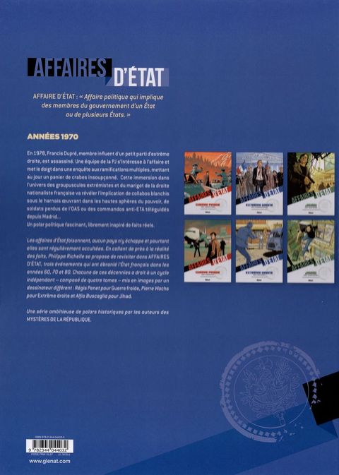 Lettre mortelleAffaire d’état : « affaire politique qui implique des membres du gouvernement d’un État ou de plusieurs États ». Elles foisonnent, aucun pays n’y échappe et pourtant elles sont régulièrement occultées. S’inspirant librement de la réalité des faits, Philippe Richelle revisite trois événements qui ont ébranlé l’État français dans les années 60, 70 et 80. Chacune de ces décennies à un cycle indépendant - composé de quatre tomes - et mis en images par un dessinateur différent. Une série-concept ambitieuse et documentée de polars historiques et d’espionnage.En 1978, Francis Dupré, brillant historien, financeur et théoricien du Parti National est froidement abattu. Le commissaire Pommard en charge de l’affaire continue son investigation. Mais l’enquête piétine après l’assassinat d’un témoin : la jeune Monique. Dupré, habitué aux menaces de mort, rédigeait un livre d’entretiens sulfureux au moment de son assassinat. Peu à peu les inspecteurs vont déterrer des preuves sordides grâce à Monique, qui a adressé une lettre à la police juste avant sa disparition ! Pommard et son équipe vont alors remonter le fil de l’histoire et apprendre plus qui n’en fallait sur Dupré ! Et s’il travaillait pour le Mossad ? L’enquête va prendre une tournure inattendue et les amener sur les traces des collabos blanchis et des soldats perdus des commandos de l’OAS jusqu’à la frontière espagnole…