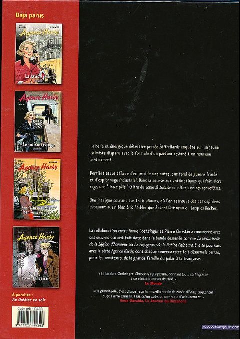 Edith Hardy, fondatrice de l'agence de détectives éponyme, va devoir franchir le rideau de fer pour retrouver un jeune scientifique disparu avec la formule d'un nouvel antibiotique. Fin du premier cycle d'une série d'espionnage délicieuse dans un Paris d'après-guerre où les Américains sont encore des sauveurs, où les intellectuels peuvent s'afficher communistes et où l'on cache un portrait de Staline dans un couvent du XIIe arrondissement. Le tandem Goetzinger Christin s'est reformé donnant toute sa fragrance à ce véritable roman dessiné. Le Monde Cet album fonctionne comme une météorite post-moderne. Libération Une série en passe de devenir une référence comme Nestor Burma. Le Figaro Magazine La presse est unanime pour saluer la reconstitution de l'un des plus prestigieux tandems de la Bande Dessinée. Croisement délectable entre Maigret et John Le Carré, la série Agence Hardy nous replonge dans une France d'après-guerre et une atmosphère de Guerre Froide qui paraît si lointaine et en même temps si proche. L'album Le Poison Rouge qui permet à Annie Goetzinger de dessiner la Place Rouge et le Goum clôture le premier cycle des aventures d'Edith Hardy.