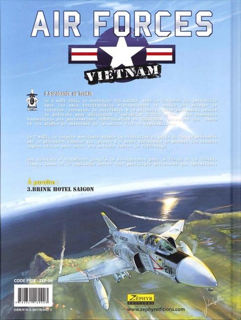 Le 4 août 1964, le destroyer USS MADDOX avec le C.Turner Joy patrouillent dans les eaux territoriales vietnamiennes et essuient une attaque de vedettes ennemies . Le secrétaire à la défense, Robert MacNamara, saisit ce prétexte pour déclencher l'opération PIERCE ARROW. Les chasseurs bombardiers des porte avions CONSTELLATION et TIDERONGA attaquent les bases et les dépôts de carburant de la marine Viet en représailles. Le 7 août, le congrès américain adopte la résolution du golfe du Tonkin présentée par le président Johnson qui permet à l'armée américaine de prendre les mesures jugées utiles pour mener des actions contre le Viêt-Cong. Les missions s'enchaînent jusqu'à la mi-septembre pour la VF-142 et la VF-143. Jimmy, Isaac et le capitaine DENVER vont participer activement aux opérations. La série AIR FORCES VIETNAM raconte les aventures de Jimmy Booster, engagé dans l'US NAVY pendant le conflit vietnamien dans les années 60/70.