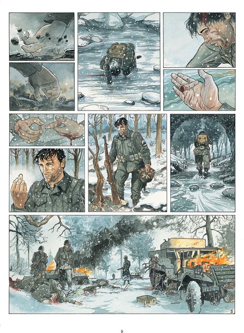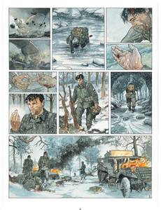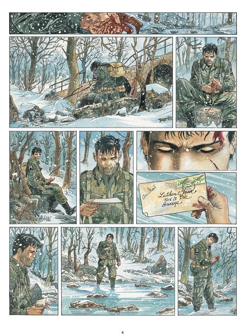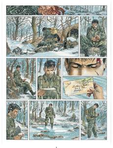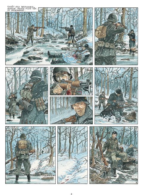 Décembre 1944 La bataille des Ardennes fait rage depuis plusieurs jours. Dans une forêt figée par la neige et le gel, d'ultimes détonations parviennent encore aux oreilles d'un GI Airborne abattu dans la neige. Face à lui, deux enfants impuissants tentent de l'empêcher de mourir. Mais dans son dos, une tache de sang s'agrandit inexorablement. Flash-back. La guerre partout, pour tous. Au milieu d'un ruisseau, Luther Yepsen et un soldat allemand se tiennent mutuellement en joue. Ils hésitent à s'entretuer. L'Allemand finit par rompre l'affrontement et disparaît entre les arbres. Luther regarde sa main gauche ensanglantée. Il lui manque deux doigts, arrachés par une balle. Fouillant désespérement le lit du cours d'eau, il trouve enfin ce qu'il cherche : son annulaire autour duquel se trouve encore son alliance. Délicatement, il la récupère. Sur la crête d'une colline, des SS enfouissent des mines sous la neige. La discorde règne entre les officiers. Evoquant une mystérieuse mission ordonnée par le Reichsführer Himmler en personne, l'un des deux hommes assassine froidement le second. Qui est donc cet Egon Kellerman qu'ils sont chargés de retrouver à tout prix ? Dans un ancien haras, Gabrielle vit seule avec ses deux derniers chevaux. La guerre lui a pris tout le reste. Tout ce qui comptait à ses yeux. Dans une forêt aux contours de brume et de danger, deux enfants perdus sont partis à la rencontre de leurs parents que, dans leur naïveté, ils croient encore vivants. Leur destin commun est en marche. Avec les deux tomes d'AIRBORNE 44 dessinés directement à l'aquarelle, Philippe Jarbinet nous livre un solide récit d'action et un vrai suspense, tout en dressant le portrait intimiste d'une passion inattendue entre un soldat américain et une jeune européenne au coeur de l'une des pires batailles de la Seconde Guerre mondiale. L'omniprésence du danger exacerbe les sentiments et les intérêts, poussant chacun à faire des choix cornéliens qui ne devraient pas être faits en temps de paix. Car une chose est sûre : la guerre ne pardonne aucune erreur et ne fait pas de quartier. Sans avoir l'air d'y toucher et en faisant preuve d'une irréprochable précision dans le moindre détail, Philippe Jarbinet nous entraîne sur les traces d'un pan de l'Histoire qui ne doit jamais tomber dans l'oubli.