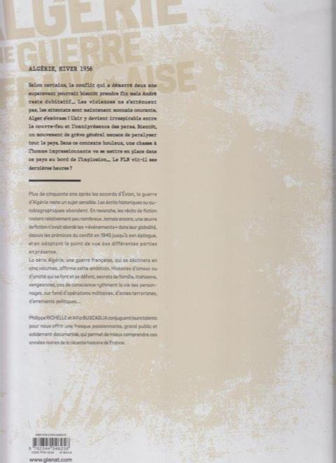 Plus rien ne peut arrêter l’escalade de la violence.Algérie, hiver 1956. Selon certains, le conflit qui a démarré deux ans auparavant pourrait bientôt prendre fin mais André reste dubitatif… Les violences ne s’atténuent pas. Pire, les attentats sont maintenant monnaie courante. Larbi Ben M’hidi, membre fondateur du FLN, suit tout ceci de près. Un matin, Amédée Froger est abattu en pleine rue et Alger s’embrase ! L’air y devient irrespirable entre le couvre-feu et l’omniprésence des paras. Bientôt, un mouvement de grève général menace de paralyser tout le pays. Dans ce contexte houleux, Loulou est recruté par les hommes de Robert Lacoste pour tenter d’arrêter les meneurs. Une chasse à l’homme impressionnante va se mettre en place dans ce pays au bord de l’implosion… Le FLN vit-il ses dernières heures ? Avec ce 3ème opus Philippe Richelle et Alfio Buscaglia poursuivent leur exploration des méandres obscurs de l’histoire de l’Algérie. Une série passionnante, grand public, nourrie aux meilleures sources documentaires, qui permet de mieux comprendre ces années noires de notre passé récent dont on s'évertue à dissimuler les cicatrices pourtant indélébiles...