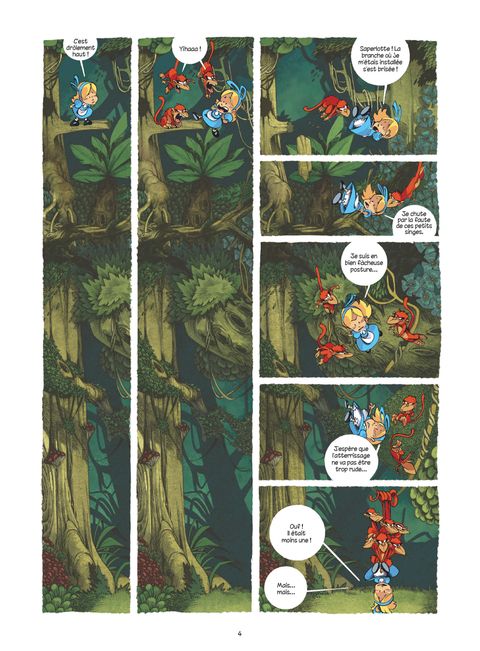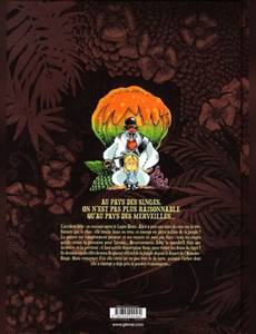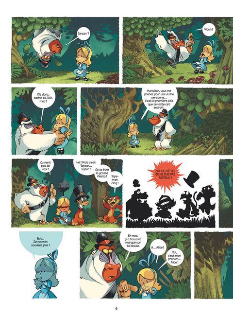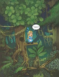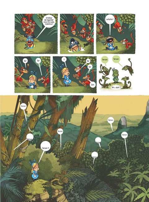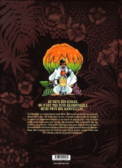 L'accident bête : en courant après le Lapin Blanc, Alice a pris une noix de coco sur la tête. Sonnée par le choc, elle tombe dans un trou, et émerge en plein milieu de la jungle ! La pauvre est complètement paumée, et ses ennuis ne sont pas finis : tous les singes qu'elle croise la prennent pour Tarzan… Heureusement, Eddy le mandrill finit par la croire, et la prévient : il faut qu'elle déguerpisse fissa, pour éviter les dents du tigre ! Ce dernier est en effet devenu Seigneur officiel de la jungle depuis le départ de l’Homme-Singe. Mais retourner d'où elle vient ne va pas être de la tarte, puisque l'arbre dont elle a émergé a déjà pris la poudre d'escampette… Tebo débride son imagination, et nous emmène dans une jungle absurde et hilarante, peuplée de personnages à contre-emploi et complètement déjantés ! Le dessin impeccable de son camarade de délire Kéramidas fait de cette aventure, enfin disponible dans un superbe format "intégrale", une fable tout public des plus mémorables.