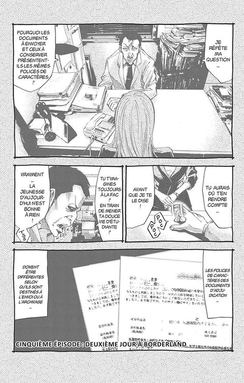 Deuxième jour à Borderland et, à peine remis du premier jeu et de la découverte du nouveau monde dans lequel il se trouve, Alice, accompagné de ses amis, va participer à un second jeu : un cache-cache géant. Première apparition d’Usagi, qui va ensuite prendre une place prépondérante dans le (...) Voir le commentaire