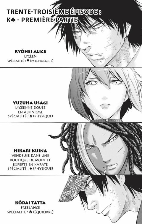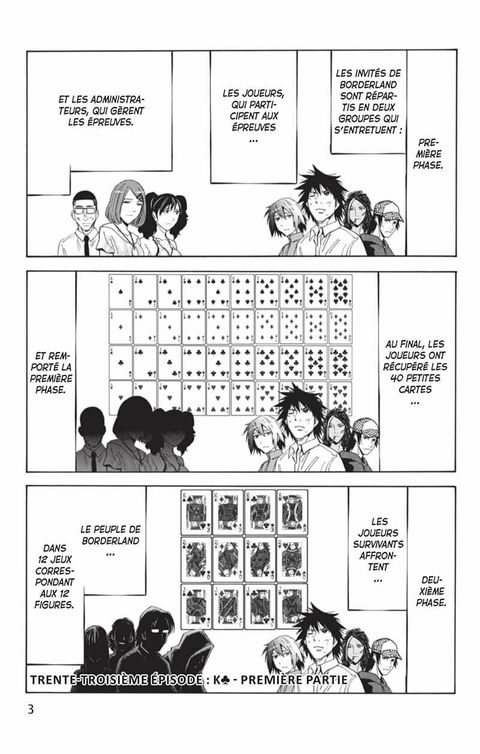 Déterminé à percer les mystères de Borderland, Alice décide d'affronter le roi de trèfle. Pour gagner, les armes ne sont plus d'aucune utilité : dans un combat psychologique où il faut remporter les points de son ennemi, Alice doit mettre en place la meilleure stratégie pour le renverser. Spécialiste de ce genre de bataille, il ne devrait pas avoir de mal à prendre l'avantage. À moins que.