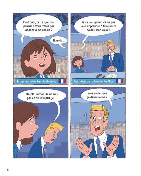 Elle est prête à tout pour commander !Alice, 9 ans et demi, est présidente de la République française. L'exercice du pouvoir ? Un jeu d'enfant, si on décide de le voir comme tel. Entourée de ses meilleurs amis Selma et Harry comme proches conseillers, de Mme Luthier, son ancienne maîtresse de CE2, comme ministre de l'Intérieur et de son chat Gaspard aux finances, Alice s'empare des sujets brûlants : écologie, éducation, statut de la fonction présidentielle, rien ne l'effraie ! Contrairement à ses homologues étrangers, souvent décontenancés par les décisions de la (très) jeune présidente française ! Citoyens, citoyennes, préparez-vous, ça change du journal télé !