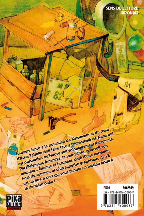 Toujours lancé à la poursuite de katsumata et du coeur d'acro, taisuke doit faire face à l'agressivité de nami qui est persuadées qu'hirose suit volontairement katsumata. Parallèlement, amamiya, la journaliste, poursuit son enquête. etrange et fascinant, doté d'une narration hors du commun et d'un superbe graphisme, alive est un titre à part qui vous tiendra en haleine jusqu'à la dernière page !.