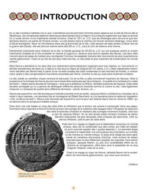 Un riche parcours en images dans la ville de Vienne à l'époque antique, alors capitale du peuple gaulois des Allobroges. Vienne est aujourd'hui, avec Lyon, la cité qui concentre le plus important patrimoine gallo-romain, dont de nombreux vestiges architecturaux en bon état de conservation. Précis et vivant, le travail de Gilbert Bouchard reconstitue tous les détails de la vie quotidienne à Vienne du temps d'Alix.