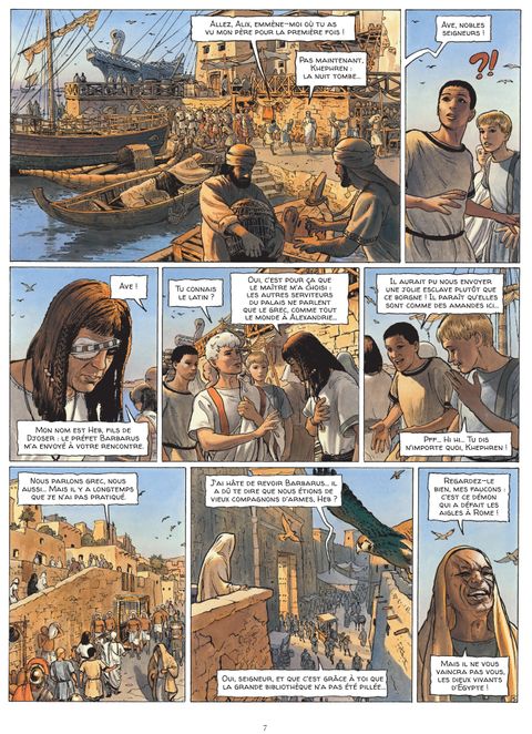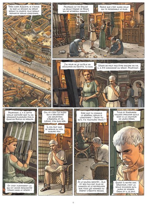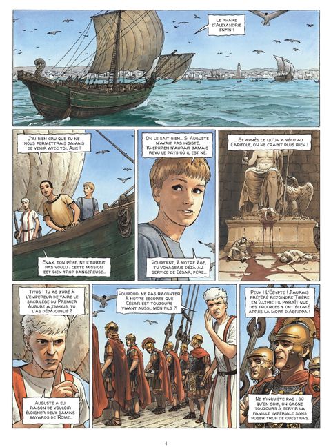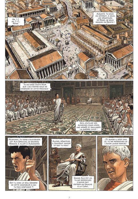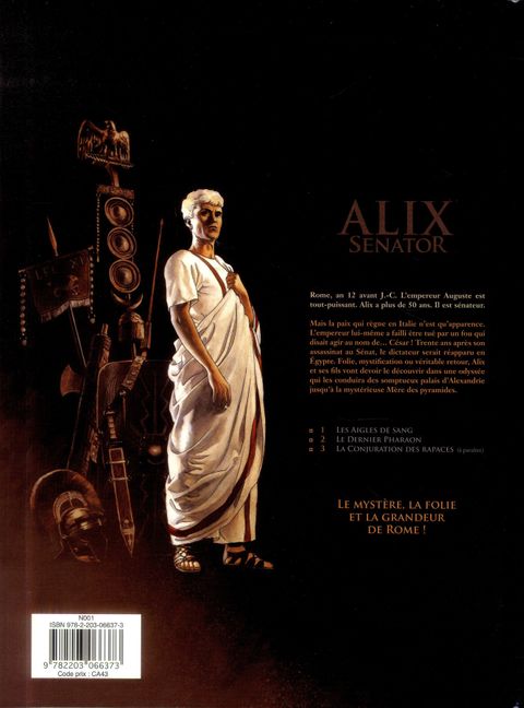 Alexandrie, an 12 avant Jésus-Christ. Accompagné de ses fils Titus et Khephren, Alix Gracchus, désormais sénateur romain, parvient à Alexandrie, où il est en mission pour le compte de son ami et protecteur, le puissant empereur Auguste. Suite aux événements tragiques survenus dans La Trahison des rapaces, Alix doit retrouver la trace du général Quintus Rufus, qu’Auguste soupçonne d’être responsable des meurtres d’Agrippa et de Lépide. Revenir ainsi en Egypte est peut-être aussi une occasion unique, pour Alix, de venger enfin la mort du père de Khephren, Enak, son ancien compagnon d’aventures. Sur place, Alix est attendu par une vieille connaissance, le préfet Barbarus. Mais aussi, dans l’ombre, par d’autres personnages, qui ne lui veulent manifestement pas du bien… Un nouvel arc narratif s’ouvre pour le célébrissime personnage créé par Jacques Martin : devenu sénateur de Rome alors qu’il aborde l’âge mûr, Alix vit de nouvelles et trépidantes aventures imaginées par Valérie Mangin et mises en images par Thierry Démarez. Une déferlante d’images fortes pour une reconstitution saisissante du quotidien du monde antique. Un événement !