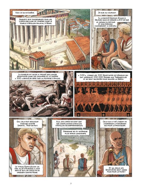 Auguste envoie Alix en mission en Grèce a! n de récupérer et d’envoyer à Rome les fameux livres sibyllins. Ces livres légendaires collationnent l’ensemble des prophéties des oracles d’Apollon. C’est d’ailleurs une prophétie d’un de ces oracles qui a appuyé le statut divin d’Auguste (voir Alix Le Tombeau Etrusque). Un commando de dissidents spartiates opposés à Rome et réclamant l’indépendance tente de s’emparer de ces livres, trésors nationaux. Alix doit intervenir. Khéphren continue discrètement à jouer un double jeu. Sa haine envers Alix est attisée par ce nouvel évènement. Il trouve légitime le fait que les livres restent en Grèce. Lors de son périple, Alix croise Héraklion, descendant spartiate. Ce dernier est un patriote, mais il admet la puissance de Rome et conteste les actes de « terrorisme » de certains de ses compatriotes. Mais tout le monde ne partage pas ce point de vue parmi les soi-disant alliés de Rome. Un nouveau complot se trame…