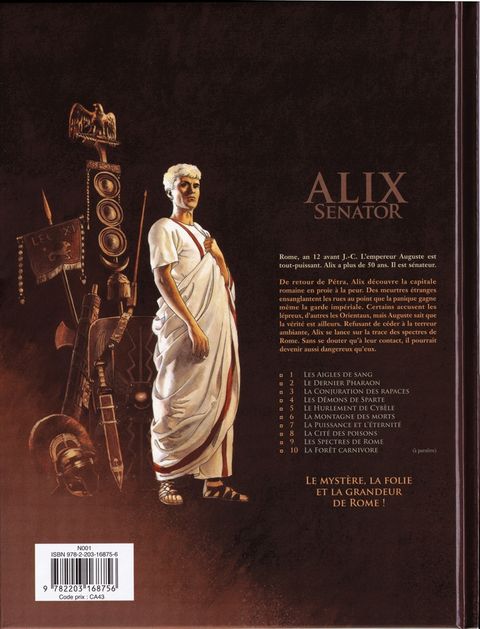 De retour de Pétra, Alix découvre la capitale romaine en proie à la peur. Des meurtres étranges ensanglantent les rues au point que la panique gagne même la garde impériale. Certains accusent les lépreux, d’autres les Orientaux, mais Auguste sait que la vérité est ailleurs. Refusant de céder à la terreur ambiante, Alix se lance sur la trace des spectres de Rome. Sans se douter qu’à leur contact, il pourrait devenir aussi dangereux.