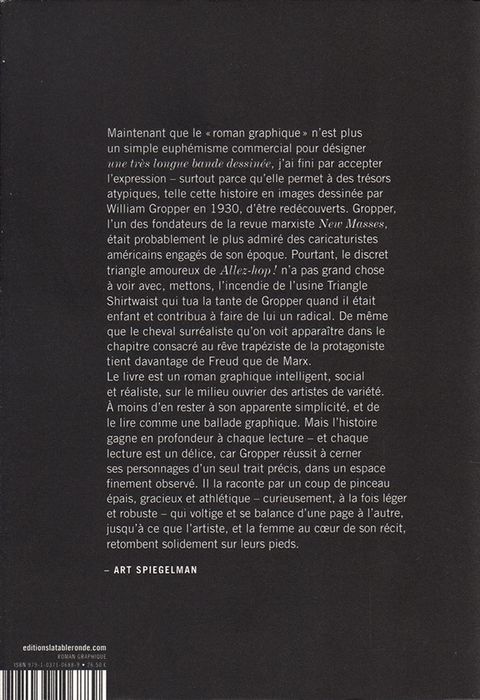 Premier et unique roman graphique de William Gropper, Allez-hop ! s'inspire des oeuvres "sans paroles" de Masereel et de Ward, et de leur format d'une seule image par page. Il est probable que le roman graphique le plus vendu de Ward, God's Man (1929), ait été le catalyseur non seulement de Allez-hop ! , mais aussi de Deux manches et la Belle (La Table Ronde, 2019). Parus aux Etats-Unis la même année, ces deux livres sont dessinés avec la même énergie en apparence brouillonne, et sont pourtant d'une esthétique savamment construite. Dans Allez-hop ! se met en place un triangle amoureux formé par un duo d'acrobates au milieu duquel vient s'interposer un chanteur d'opéra. Ce dernier promet monts et merveilles à la femme, parvient à l'épouser, mais pas à évincer tout à fait l'homme acrobate, dont il devient horriblement jaloux... Un conte poignant et étonnamment moderne, aux rebondissements multiples. Alay-Oop (du français Allez hop), est en anglais un terme de basketball, qui désigne une variante du dunk.