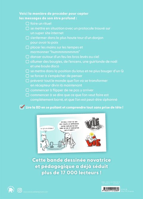Voici la manière de procéder pour capter les messages de son être profond :- faire un rituel- se mettre en situation avec un protocole trouvé sur un super site internet- s'enfermer dans la plus haute tour d’un donjon pour avoir la paix- placer les mains sur les tempes et marmonner “hummmmmmmm”- danser autour d’un feu les bras levés au ciel- allumer des bougies, de l’encens, une guirlande de noël et une boule disco- se mettre dans la position du lotus et ne plus bouger d’un Q- se forcer à sempêcher de penser- prévenir tout le monde que l’on va se transformer en récepteur divin là maintenant- commencer à flipper de ne pas y arriver- commencer à se dire que ce que l’on veut faire estcomplètement barré, et que l’on est peut-être siphonné- Lire la BD en se poilant et comprendre tout sans prise de tête !Cette bande dessinée novatrice et pédagogique a déjà séduit plus de 17 OOO lecteurs !