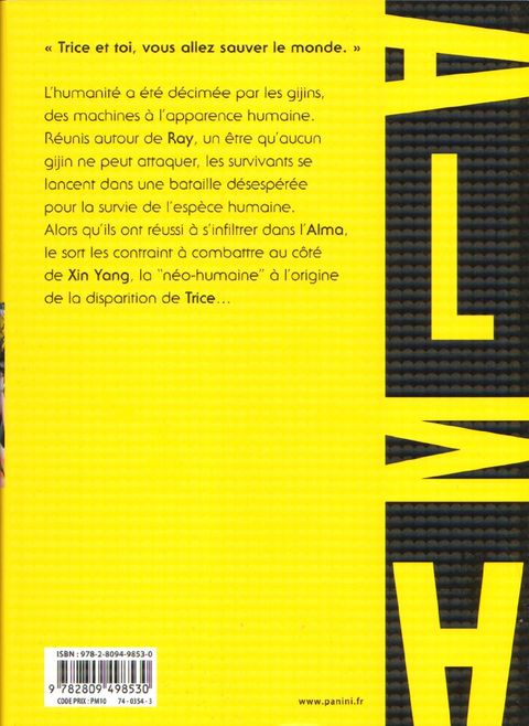 "Trice et toi, vous allez sauver le monde". L'humanité a été détruite par des androïdes, les Gijins. Regroupés derrière Ray, un être qu'aucun Gijin ne peut attaquer, les survivants tentent une dernière riposte pour sauver l'humanité. Alors qu'ils se sont infiltrés dans l'Alma, la base des Gijins, ces rescapés doivent combattre au côté de Xinyan, la "néo-humaine" qui est responsable de la séparation de Ray et de Trice (la Gijin avec laquelle il a vécu pendant quinze ans). Qu'adviendra-t-il du coeur de Ray et de l'humanité ? L'auteur Shinji Mito a remporté en 2015, le prix du jeune talent Quatre saisons du magazine Afternoon (publié aux éditions Kodansha) pour son one shot Allegro. Après une histoire courte en 2016, il imagine les deux tomes de Dareka no sekai puis se consacre à Alma prépublié dans le Weekly Young Jump entre 2019 et 2020. Dans cette oeuvre d'anticipation où humains et machines s'affrontent sans merci, Shinji Mito fait cohabiter cet univers SF post apocalyptique avec le monde intérieur très poétique, et teinté d'humour, du héros. A souligner : les dessins incroyables du mangaka.