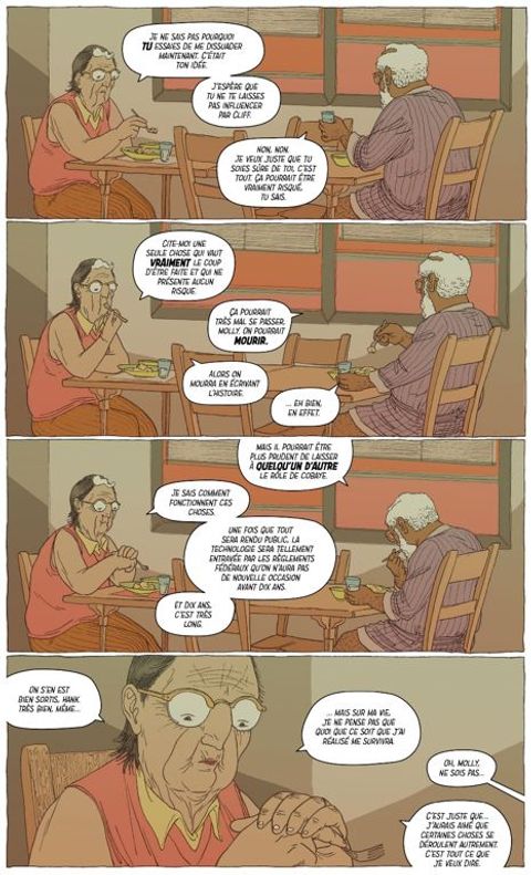 Grosse découverte pour moi que ce graphic Novel ! Une œuvre entre science fiction, suspens Polard et horreur parfaitement dosé. Un scénario ciselé au cordeau pour nous raconter ce fantasme qu'est la vie éternelle. Un couple de vieillards vont être les premiers humains à être clonés afin de poursuivre leur vie en retrouvant (...) Voir le commentaire