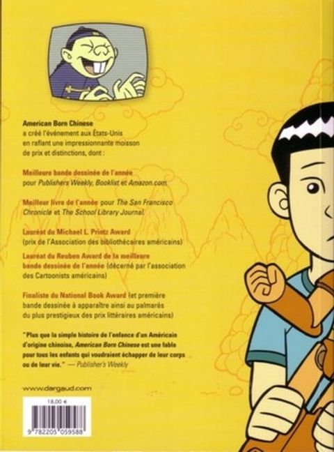 Quand la famille de Jin Wang déménage, il réalise brutalement qu'il est le seul élève d'origine chinoise de sa nouvelle école. Les moqueries et brimades s'abattent sur lui, et il peine à se faire des copains. Encore pire, il tombe amoureux d'une fille blanche... Comme tout ""American Born Chinese"" (Américain d'origine chinoise) Jin Wang connaît la légende du Roi des Singes, mais aussi la honte d'être confronté au stéréotype du Chinois à grandes nattes et langage exotique... Deux aspects de la communauté racontés ici dans un style mi-manga mi-ligne claire, totalement attachant et lisible. American Born Chinese est la bande dessinée événement de l'année aux États-Unis, tant elle a récolté de prix et distinctions. Semi-autobiographie, cet album hilarant et poignant éclaire d'un jour nouveau une communauté réputée pour sa discrétion : les Chinois de l'étranger. - Première bande dessinée de l'histoire à être finaliste de l'éminemment prestigieux National Book Award. - Prix Michael L. Printz (meilleur livre destiné à la jeunesse, habituellement attribué à des romans) - Meilleur livre de l'année pour Publisher's Weekly (équivalent de Livres Hebdo) - Meilleur livre de l'année pour School Library Journal (Journal des Bibliohèques Scolaires) - Meilleur livre de l'année pour le San Francisco Chronicle - Meilleure BD de l'année pour Amazon.com