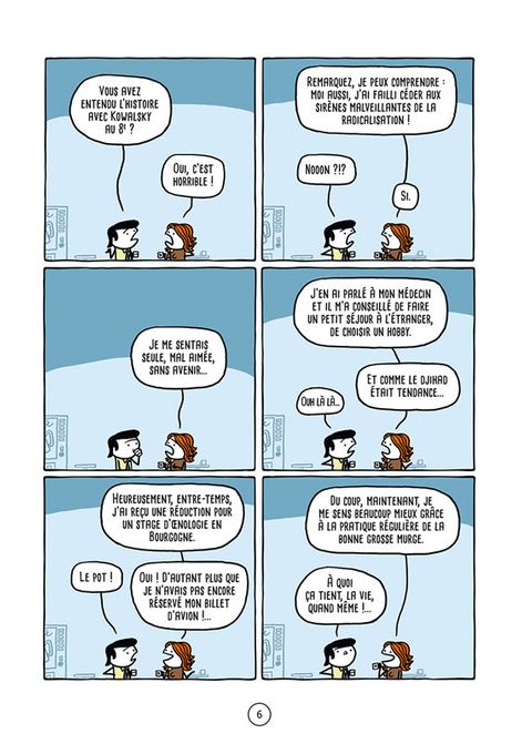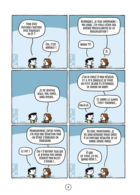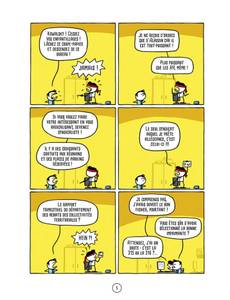 Du rire en strip. Les graphismes minimalistes de Dubuisson suffisent à raconter ses blagues. Le format strip est efficace. Chaque page fonctionne indépendamment des autres bien qu'elles soient inégales et que certaines s'apprécient plus avec du contexte. Dubuisson se moque de tous les personnages sans préférence, même ceux hors des pages.